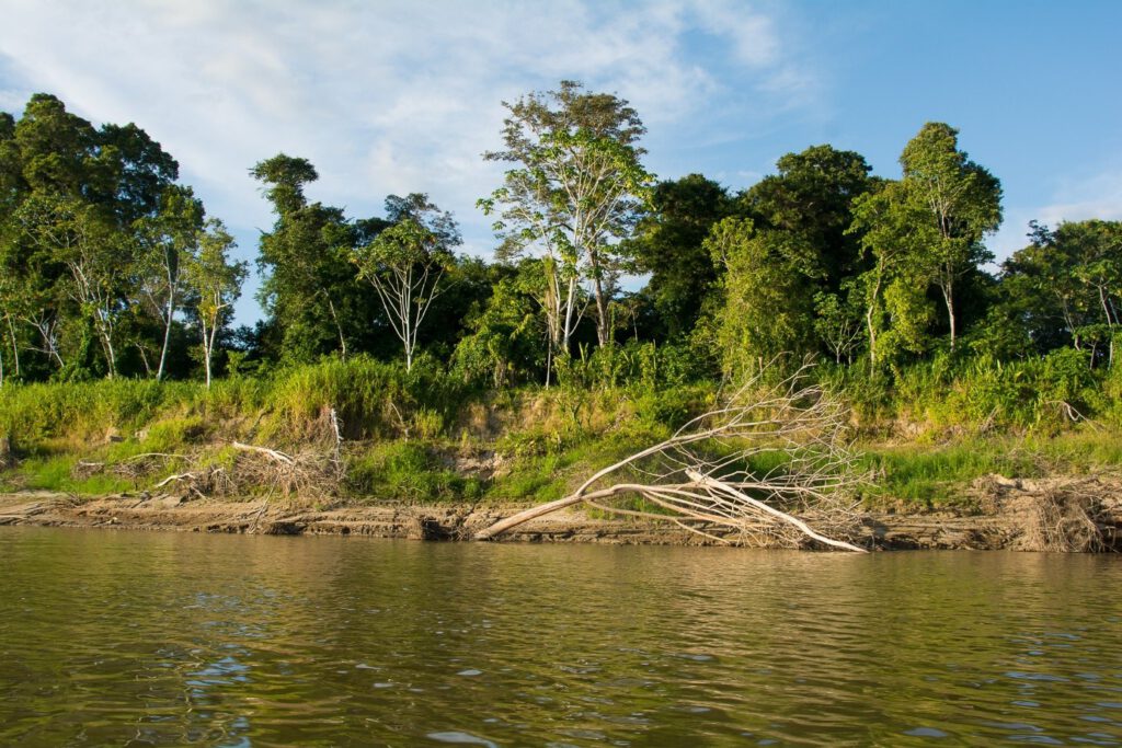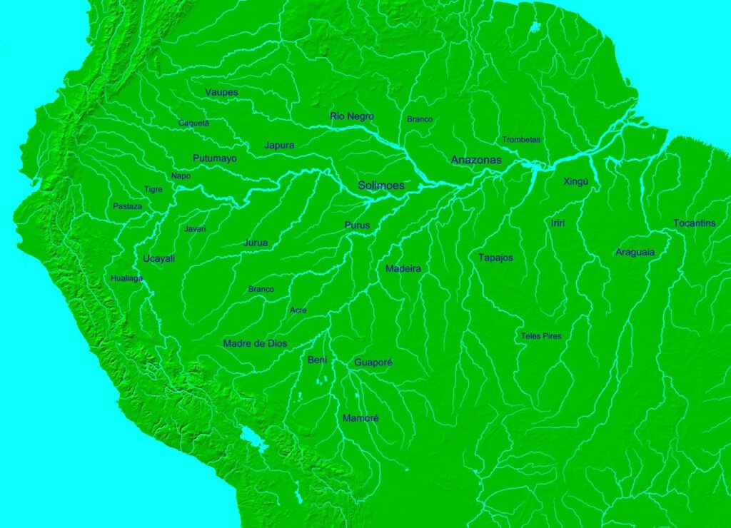 Der Einzugsbereich des Amazonas weist im Mittel- und Unterlauf kaum Höhenunterschiede auf. Bis an den Brasilianischen Schild mäandern die träge fließenden Weißwasserflüsse deshalb nur sehr langsam, wie auf der folgenden Abbildung zu erkennen ist.