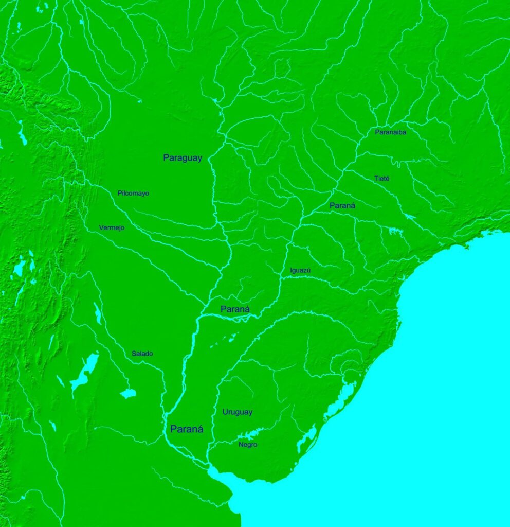 Der Paraguay fließt von Norden nach Süden und vereinigt sich mit dem Paraná, der den südöstlichen Bereich von Brasilien entwässert. Über das im Norden gelegene Pantanal besteht eine Verbindung zum Einzugsbereich des Rio Madeira. Obwohl das Einzugsgebiet fast 3 Millionen Quadratkilometer beinhaltet, ist die mittlere Abflussmenge mit weniger als 20 000 m3/s deutlich geringer als die des Amazonas oder Orinoko.