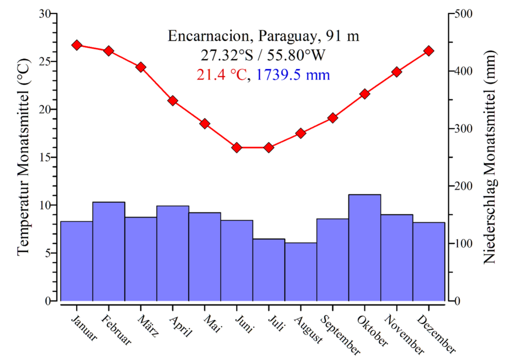 Klimadiagramm von Encarnación, das im Süden von Paraguay am Paraná liegt. Hier spürt man bereits ausgeprägte Temperaturschwankungen mit deutlichen Abkühlung im Südwinter. (Grafik: Stefan Karl Hetz)