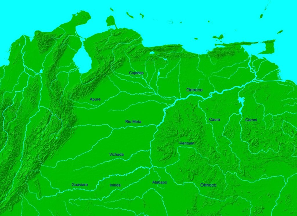 Im Norden entwässert der Orinoko, dessen Zuflüsse vor allem aus Kolumbien und Venezuela stammen, in den Atlantik. Die aus den kolumbianischen Anden im Westen stammenden Flüsse führen vor allem Weißwasser (Guaviare, Meta), während die aus dem geologisch alten Guayana-Schild (Ventuari, Caroni) und dem südwestlichen kolumbionischen Tiefland (Inirida) stammenden Flüsse zum geringen Teil Klarwasser und oft auch Schwarzwasser (Atabapo) führen.