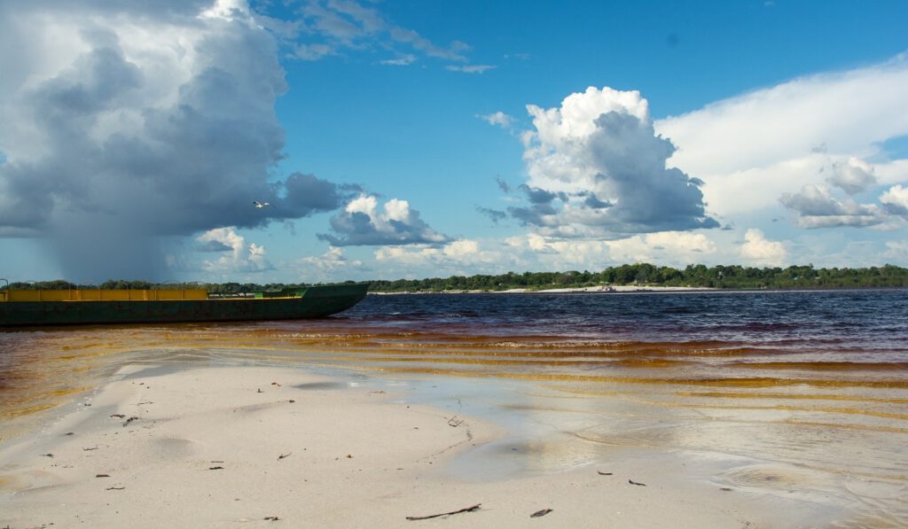 Ufer des Atabapo kurz nach einem Gewitter im Januar 2015. Das gegenüberliegende Ufer liegt in Venezuela. Auffällig ist der weiße Sand, der mit dem Schwarzwasser eine starken Kontrast bildet. (Abbildung: Stefan Karl Hetz)