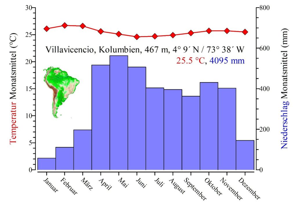 Villavicencio am Osthang der Anden weist mit ca. 4000 mm sehr hohe Jahresniederschlagssummen auf. Diese sind relativ gleichmäßig über das Jahr verteilt. (Grafik: Stefan Karl Hetz)