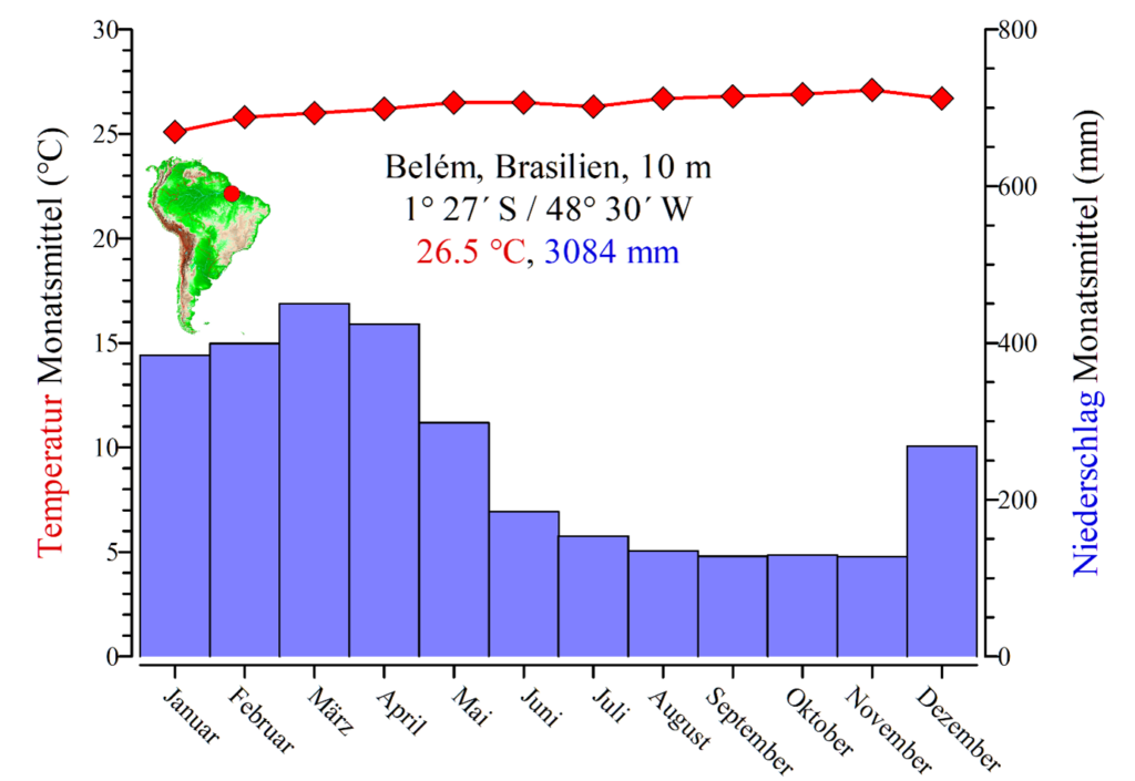 Klimadiagramm von Belém mit ganzjährig hohen Temperaturen und saisonal ausgeprägten Niederschlägen. (Grafik: Stefan Karl Hetz)
